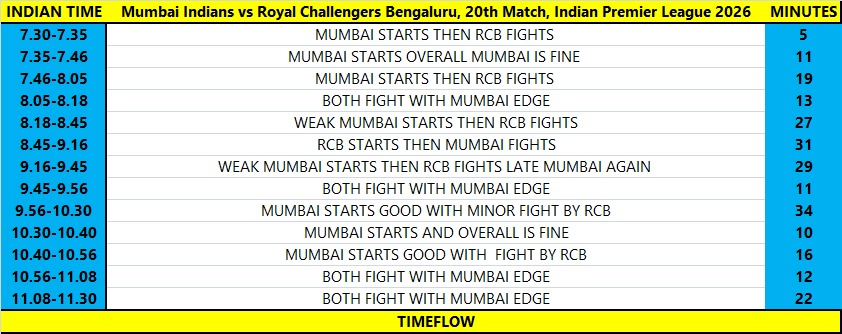 The 20th match of Indian Premier League 2026 between Mumbai Indians and Royal Challengers Bengaluru looks highly competitive as per the astrology time flow chart. The planetary momentum suggests Mumbai Indians getting more favourable phases, but RCB is expected to give strong fight in middle overs.
