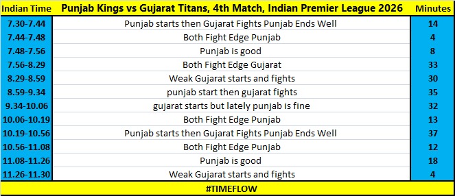 INDIAN TIME 8.29-8.59 GUJARAT GIVES FIGHT IN GAME , FROM 8.59 -10.19 PUNJAB MANAGES DAMAGE AND AGAIN FROM 10.56-11.08 PUNJAB PLAYS GOOD