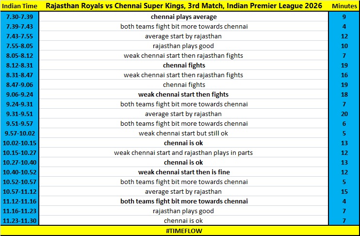 Rajasthan Royals vs Chennai Super Kings, 3rd Match, Indian Premier League 2026 INDIAN TIME 8.12-8.31 CHENNAI PLAYS FINE AGAIN FROM 10.27-10.52 CHENNAI PLAYS FINE.